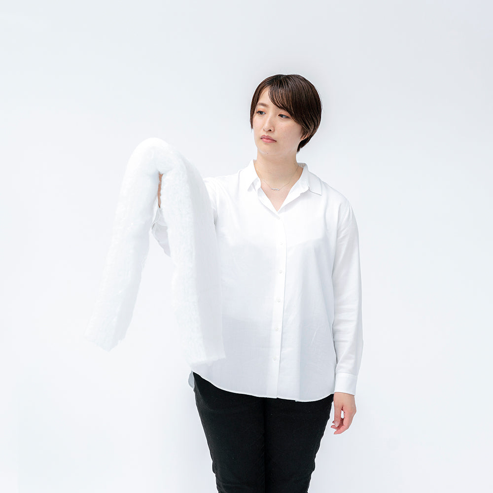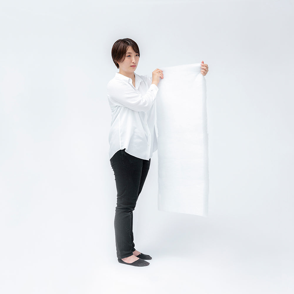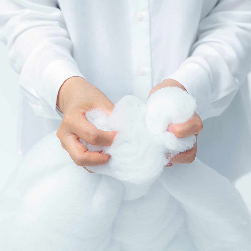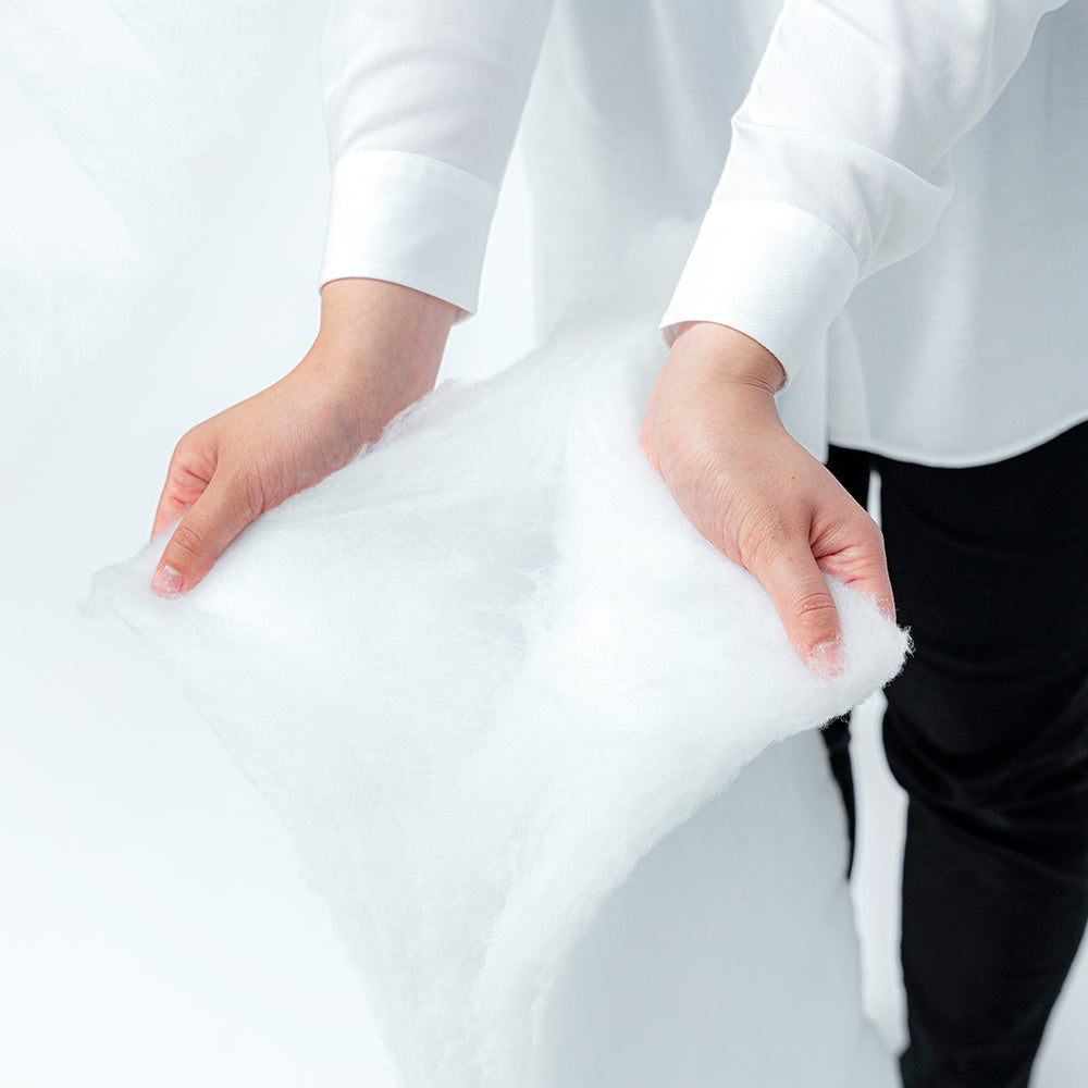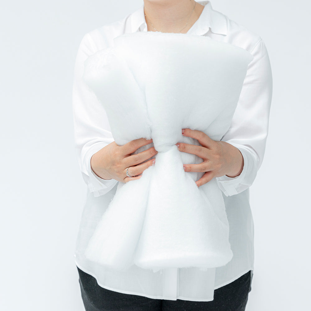 密度10kg/m3のホワイトキューオンふわふわタイプです。ホワイトキューオンの中で最も面密度が低く、柔らかくふわふわしたタイプ。加工しやすいので、様々な用途にお使いいただけます。ペットボトルと同じポリエステル100%だから、肌に触れても安心です。