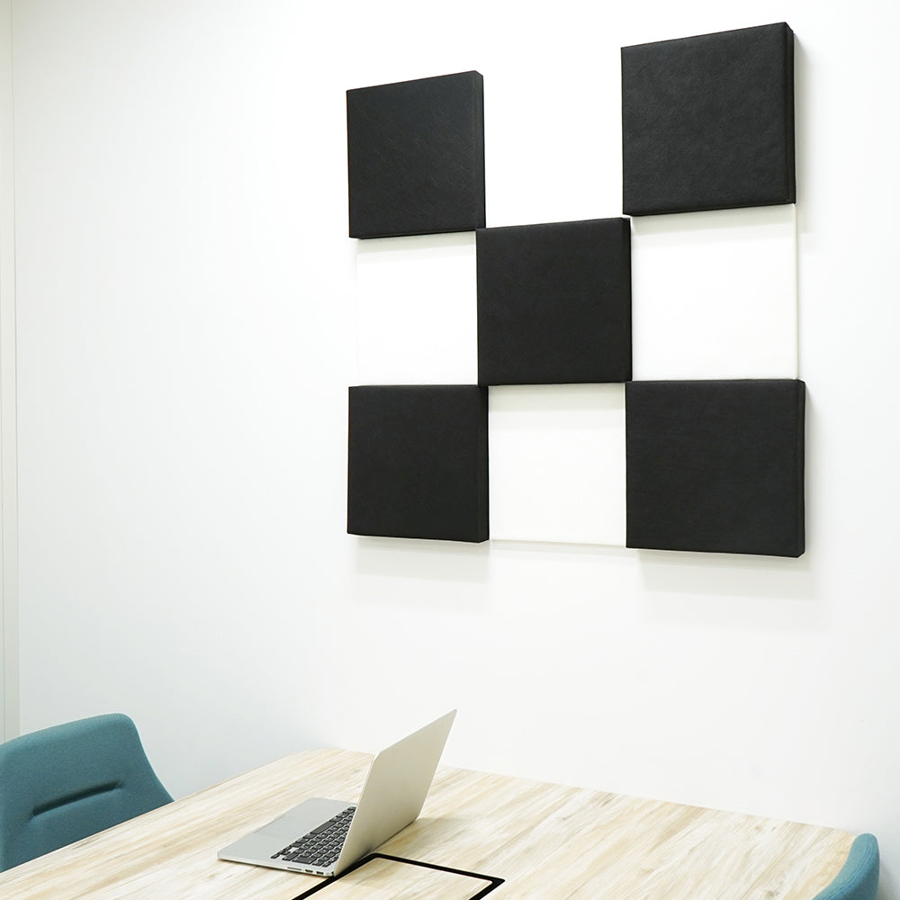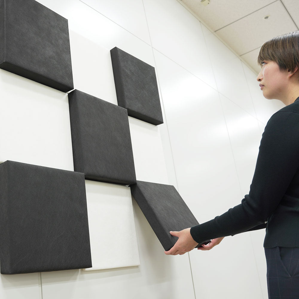 お部屋の壁に貼り付けて、防音対策が可能です。ホワイトキューオンの特性で、吸音をしっかり行います。お部屋の雰囲気に合わせて、色をお選びいただけます。