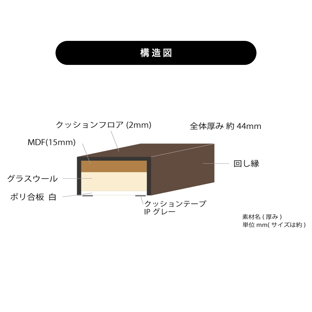(構造:MDF、高密度グラスウール、化粧合板、表面クッションフロアー仕上げ。)